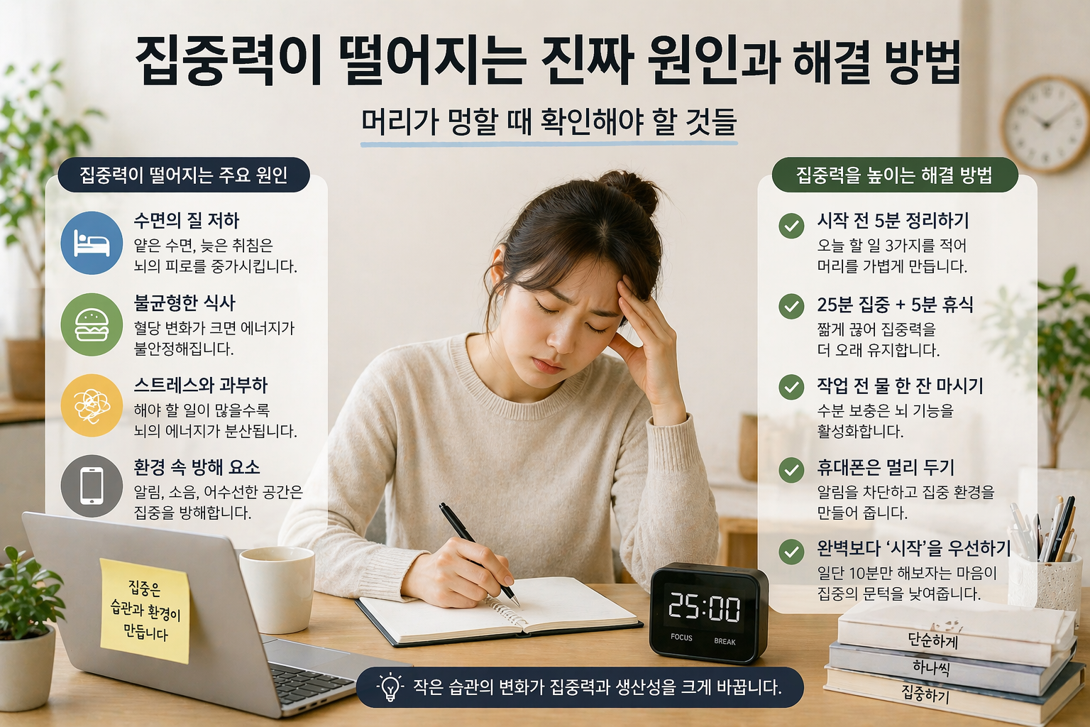 집중력이 떨어지는 날은 의지 부족이 아니라 몸과 환경이 보내는 신호일 수 있다는 것을 저는 직접 느꼈습니다. 작은 조건만 바꿔도 머리가 맑아지고 일의 효율은 달라질 수 있습니다.